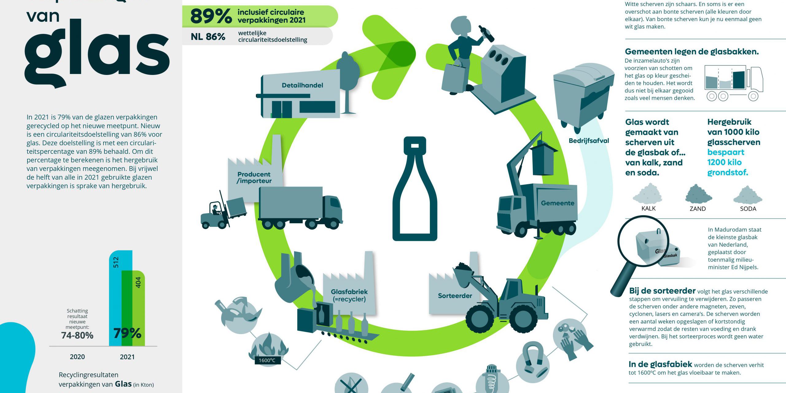 Bekijk en download de infographic over de recycling van glazen verpakkingen 2021 (Afvalfonds Verpakkingen, dit is de infographic hierboven afgebeeld).