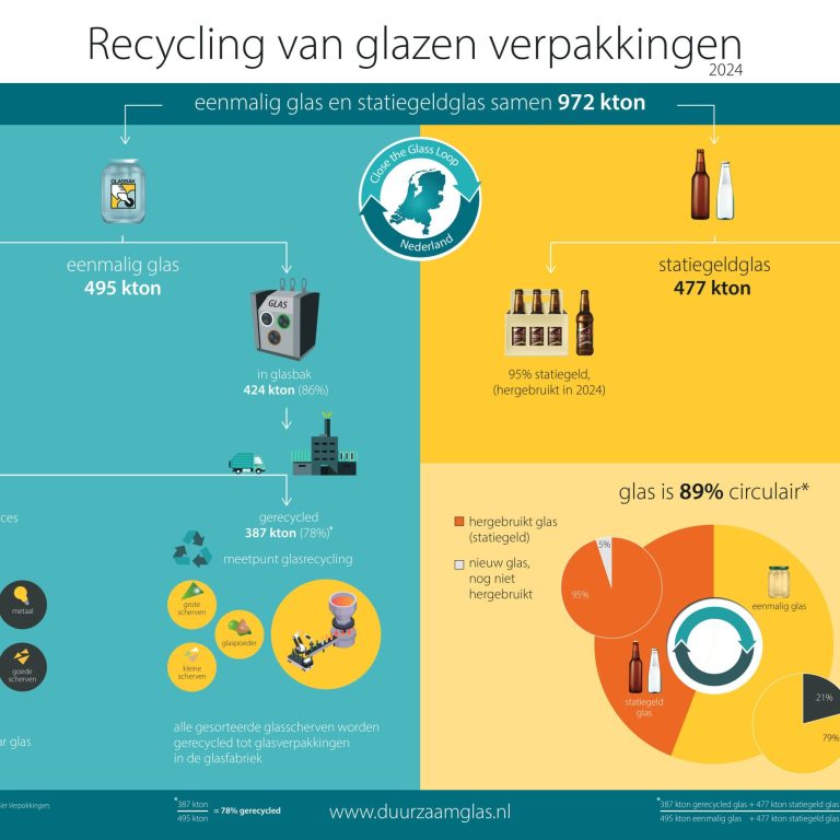 We gebruiken elk jaar gemiddeld 29 kilo glas per persoon. 21 kilo brengen we naar de glasbak en wordt gegarandeerd gerecycled. Er worden weer nieuwe flessen en potjes van gemaakt. 8 kilo verdwijnt nog in het restafval. Dat is in…
