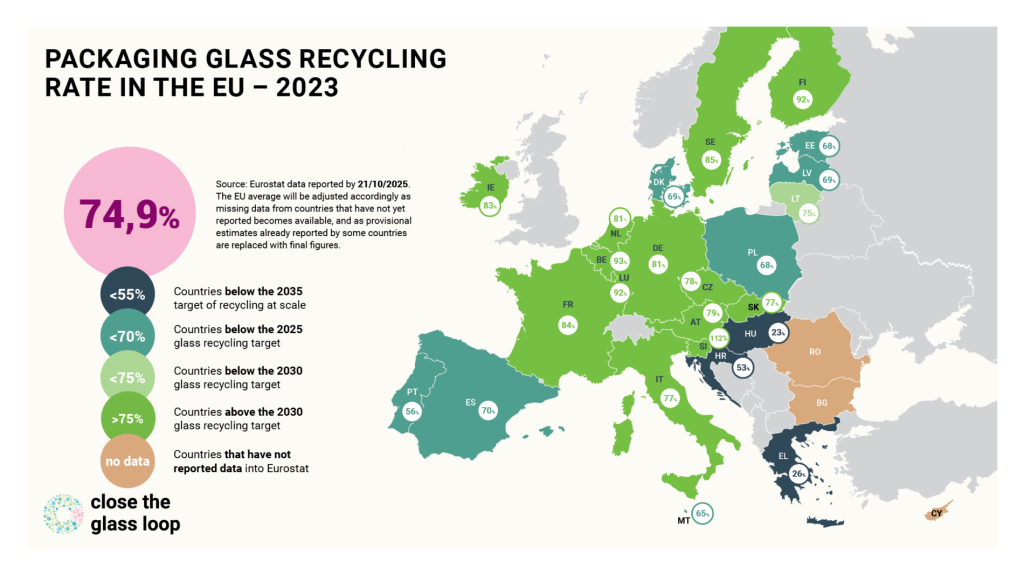 Gemiddeld wordt in de 27 Europese landen 80,8% van het verpakkingsglas gescheiden ingezameld (2023). Ruim 11 miljoen ton glas wordt gerecycled. Daarvan wordt naar schatting 92% gerecycled tot nieuwe glazen verpakkingen: closed loop (‘van glas tot glas’). Het gemiddelde glasrecyclingpercentage in Europa is volgens Eurostat 74,9%. Elke ton gerecycled glas betekent minder (rest)afval, vermeden CO2-uitstoot en besparing van primaire grondstoffen.